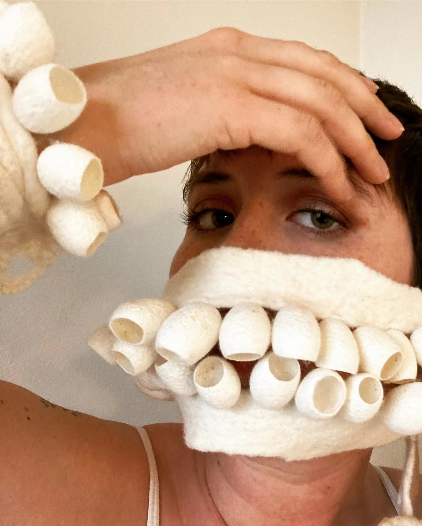 Raucous Joy was the culminating show that my mom, Chandra Rice, did after a year of developing a body of work. I was asked to interact with and wear some of the work that was created. The photos that she took were included as part of the resulting exhibitions.